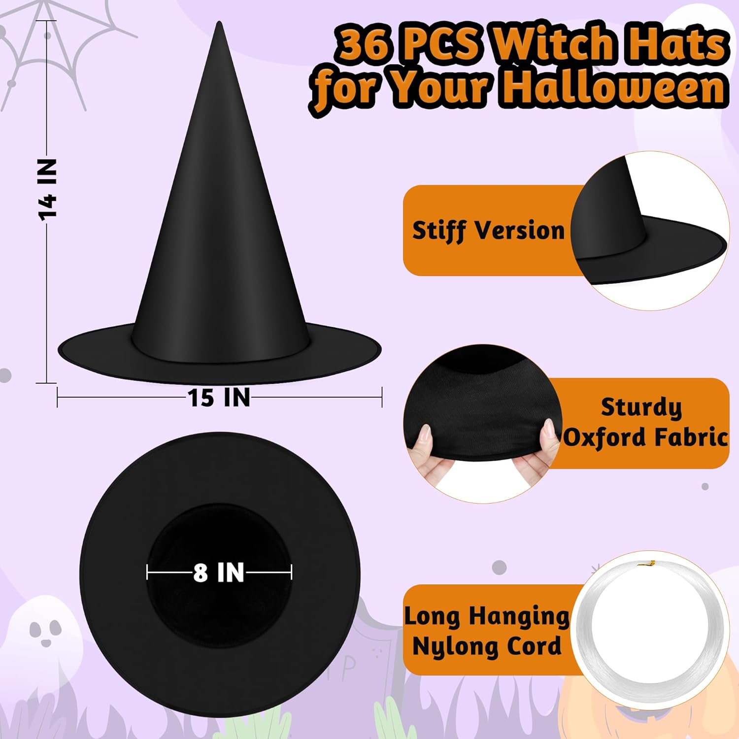 - Material: Crafted from durable 210D Oxford cloth, these black witch hats are soft, comfortable, and designed to withstand the Halloween festivities. They can be easily folded for convenient storage.